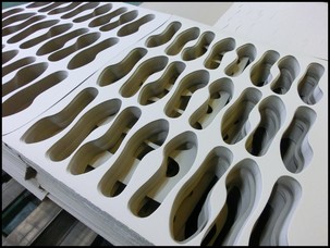 まるでお菓子のクッキーの生地を型抜きするように、四角い段シートから足型を打ち抜いていきます。打ち抜きには厚いベニヤ板にカット刃を足の形に配置した「木型」と呼ばれる刃物が使われます。一つのシートからとれるアシートはサイズによりばらつきがあり、たとえば男性用27cmの場合ですと、写真のように7足とれます。女性用サイズの場合はもう少し増えます。